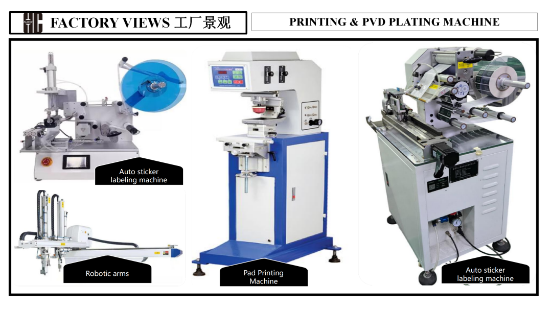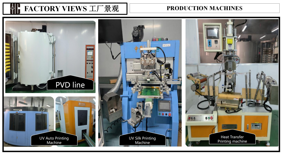 →Facility & Equipment: Having an area of 20,000 m², our factory entails 4 assembly lines, 50 injection molding machines (including 120T;160T; 260T; 380T ;), 2 water bottle blow molding machines, 2 press machines and 2 dropping machines, 1 Tritan extrusion machine and 1 PP extrusion machine, and robotic arms and automated production lines without a human touch. Moreover, we have facilities such as specific printing & PVD plating lines (UV auto printing, silk printing, pad printing, heat transfer) so that matching to the customer's special requirements is realized.