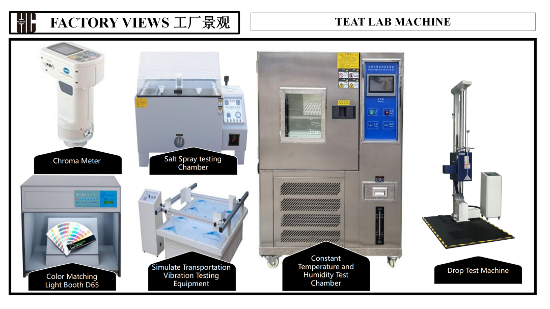 We leave nothing to chance when it comes to quality our company. We have put in place stringent measures that ensure product quality is ensured right from the start to the end. Our modern test center has a wide range of top-notch testing machines like:Constant Temperature & Humidity Test Chamber, Simulated Transportation Vibration Tester, Salt Spray Test Chamber, D65 Color Matching Light Booth, Drop Test Machine, Chroma Meter, and precision measuring tools (caliper, force gauge, digital torque meter, etc.). With such a process of inspection, all the products that go out are officially certified for quality and safety.